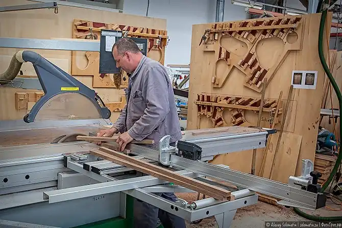 Циркулярная пила для нарезки элементов рояля. Справа висят шаблоны, по которым рабочий режет необходимые рейки: