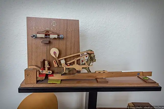 В проходной фабрики нас встречает макет запатентованного механизма, который осуществляет процесс передачи нажатия клавиши к удару по струне молоточком: