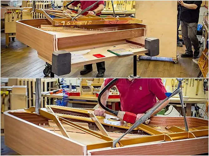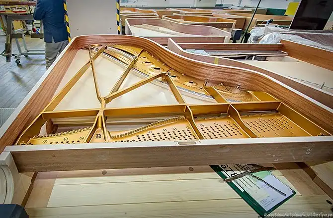 Следующим этапом раму при помощи крана устанавливают в рояль: