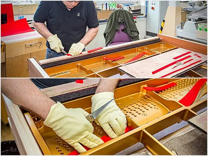 За тем следует укладка специального красного войлока в тех местах, где будет соприкосновение струн с металлом: