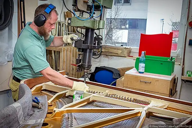 На древесине остановлюсь подробнее. Именно она играет важнейшую роль в рождении настоящего, акустического звука. Порода деревьев используется разная. Дерево должно быть созревшее и высушенное специальных условиях. Для некоторых элементов древесина сушится 2 года. На фабрике есть специальный человек, который летает в буквальном смысле по всему миру и отбирает еще растущие деревья, которые потом обрабатываются специальным образом и доставляются в Германию. Часть пород закупается, к примеру, на Аляске, редкие породы дерева поставляются из Африки.