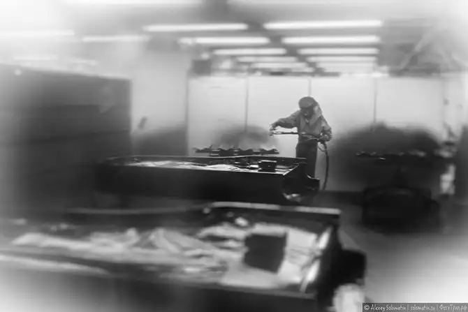 Отвлечемся немного от чистовой работы и посмотрим, как красят рояли. Что бы рабочему попасть в помещение для окраски нужно воспользоваться средствами защиты: