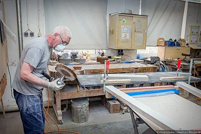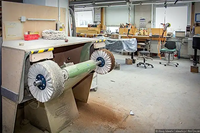 Для полировки используют как ручные машинки (дальний план) так и большие, стационарные круги: