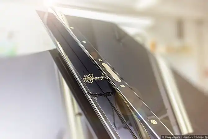 Скелет еще называют позвоночником, т.к. он держит тяжеленную чугунную раму массой 140 кг. В центральном рояле видно поперчены скелета, которые придают еще и жесткость всему инструменту: