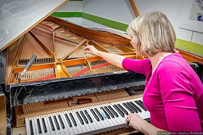 Женщина на фото настоящая легенда фабрики Стэйнуэй, ну по крайней мере так нам ее представили. Зовут ее Вэбкэ Вунсторф.