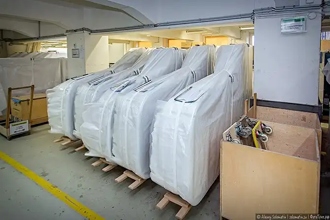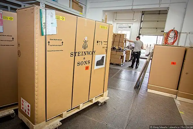 И отправляются на склад готовой продукции. Упакованный рояль состоит из двух коробок. Первая – сам рояль: