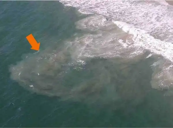Видимый канал бурлящей воды, перпендикулярный берегу.