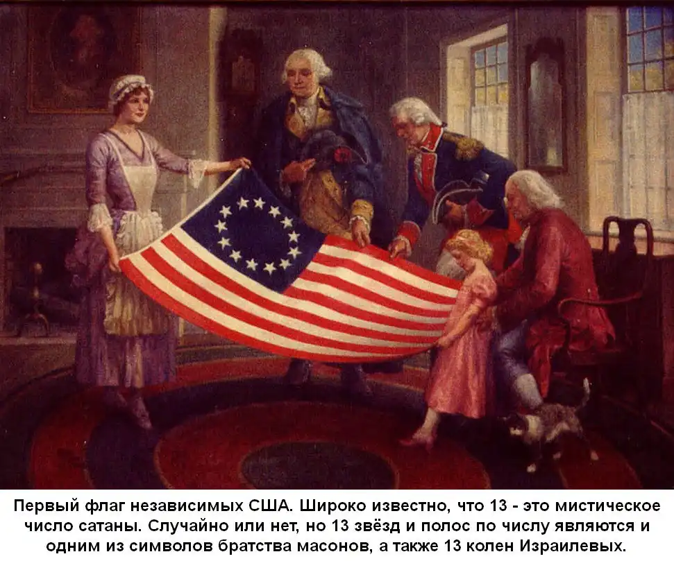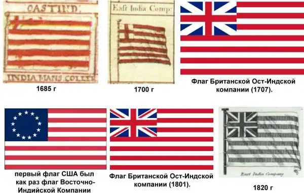 Так, как генуэзцы-торгаши колонизировали Голландию и Англию, то первый флаг США был как раз флаг Восточно-Индийской Компании с 13 полосами и 13 звёздами "Евросоюза", то есть 13 колен израилевых.
