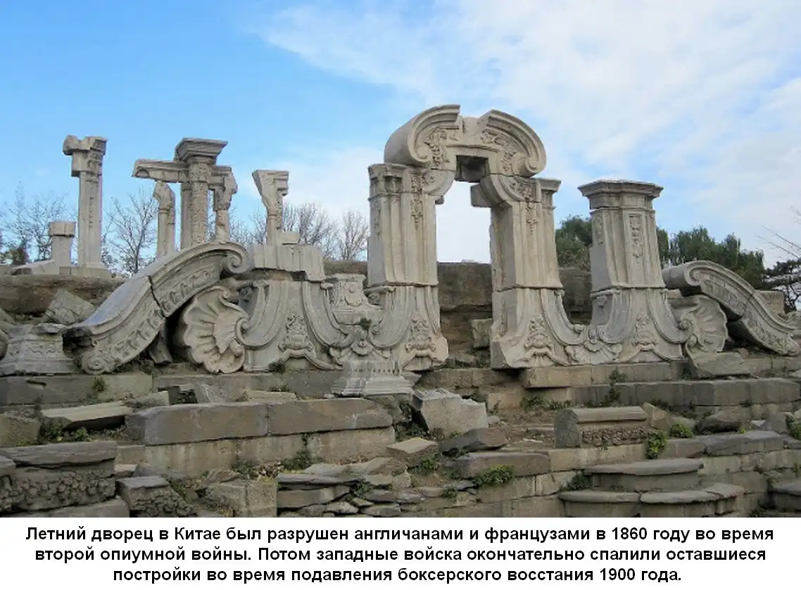 Бывшие "друзья" назвали этот период Второй Опиумной войной и в 1860 году англо-французские войска подошли к Пекину. Император бежал в Горное убежище, а князя Гуна Исиня оставил вести переговоры. Британский и французский послы потребовали, чтобы великий князь Гун до 23 октября принял условия мира, угрожая в противном случае сжечь императорский дворец в Пекине и подвергнуть пушечному обстрелу город. Для устрашения они выбрали дворец Юаньминьюань и подвергли его грабежу и полному разрушению. Этот дворец мешал иезуитам, он не вписывался своим видом в исторические построения Китайской истории и напоминал об истинном происхождении манжуров. Но осталась беседка в виде свастики, её формы были не так заметны.
