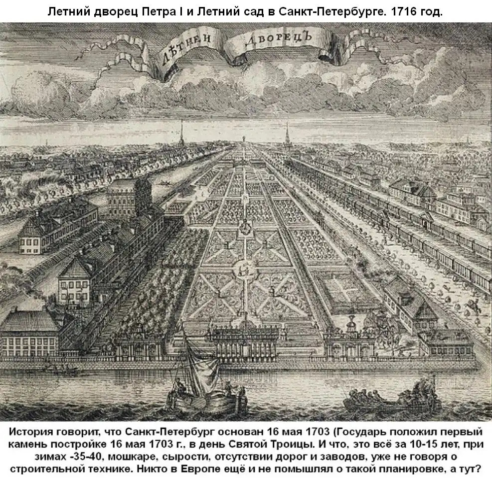 В то, что планировка, разбивка и привязка зданий Питера при Петре 1 велась без геодезистов верится с трудом, поражает размах и точность, объёмы и территория. Так, что стоял город задолго до нынешней исторической версии его появления. И тут напрашивается вопрос историкам, город был заложен или отреставрирован Петром? Правду в летописях мы уже не найдём, всё подчистили переписчики, остаётся надеяться на их ошибки, как к примеру, пропустили у Зубова.