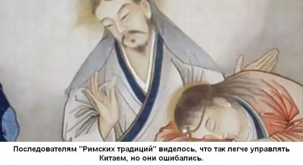 В это время на троне уже восседает Сюанье. Ему 16 лет. Он изучает маньчжурское боевое искусство и конфуцианство. Женат на племяннице высокочтимого мандарина Сонготоу, но государством, по сути, не правит, а предается утехам молодости. Государством же при молодом императоре правит Сонготоу. А при нем - ватага иезуитов-советников. Эти братья христолюбивые сеют свои семена в Китае еще с XIII века - вспомним миссионера Карпини, первого "засланца", которого папа отправил 16 апреля 1245 года с мирным поручением - принять католичество. Разумеется, "монголы" не приняли католичество, в XIII веке они продолжали оставаться язычниками, веротерпимыми к любой религии. Среди них были казаки разной веры, православные, мусульмане, несториане, иудеи, но вот католиков не было. Однако вера в то, что монголы, как в Сибири, так и в Китае смогут принять крещение, надолго укоренилась в западных умах.