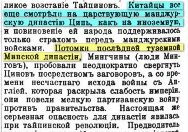 Есть мнение, что в Китае не существует литературы, исторических хроник, написанных на бумаге ранее XVIII века. Но иезуиты расписали историю Китая продолжительностью в 8000 лет, и где там правда, а где вымысел, поди разбери. Тема эта очень интересная, и её можно было бы не трогать из уважения к трудолюбивым китайцам. Однако, Китай считает Сибирь и наш Дальний Восток своей собственностью. Поэтому придётся напомнить нашим китайским друзьям, что благодаря России, Китай существует, как государство.