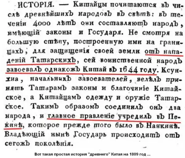 Можно привести пример, откуда взялись китайские названия сибирских народов. Называть Сибирскую Русь "Великой Тартарией", а её конных воинов татарами было обычным явлением и в России, и в Западной Европе даже в XVII и в XVIII вв. В 1673 г. вышла книга "Посольство от нидерландской Восточно-Индийской Компании к Великому татарскому хану". Хан - это обычное воинское звание русского князя, а с приставкой "ка", означал высший чин, это название использовали многие народы, позже закрепилось только в азиатских странах, а кахан-каган у иудеев.