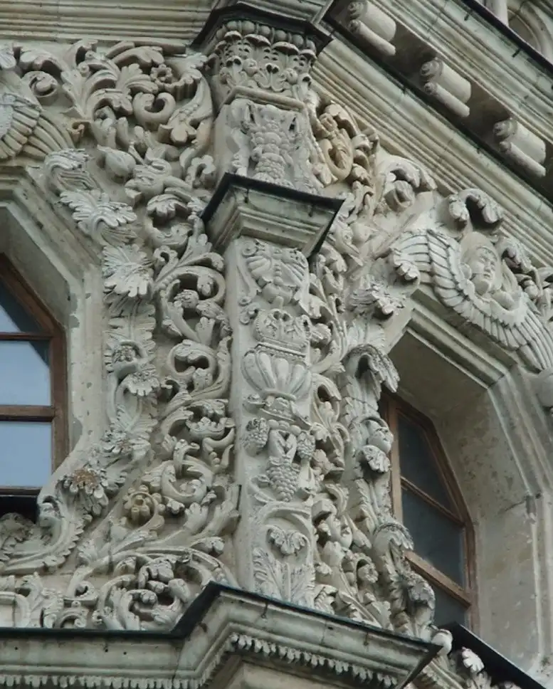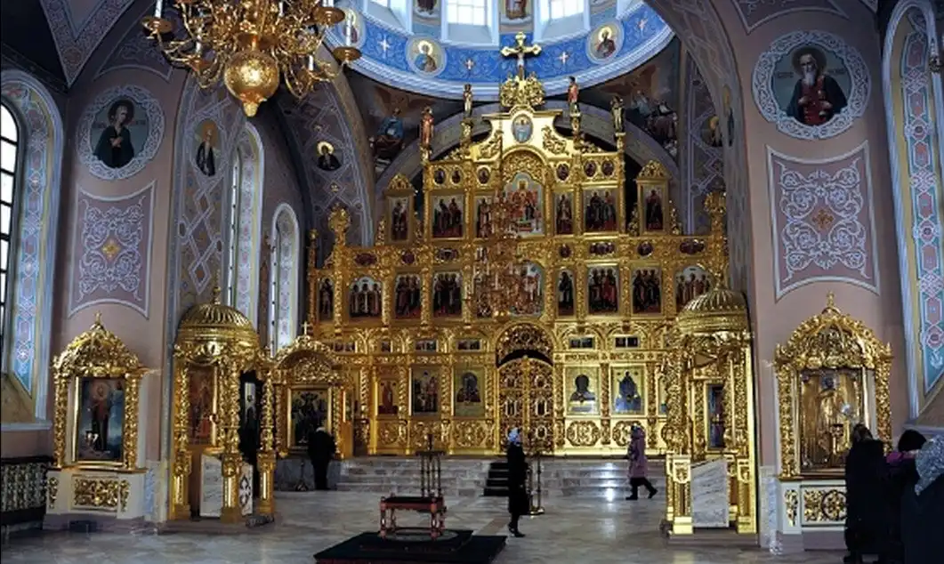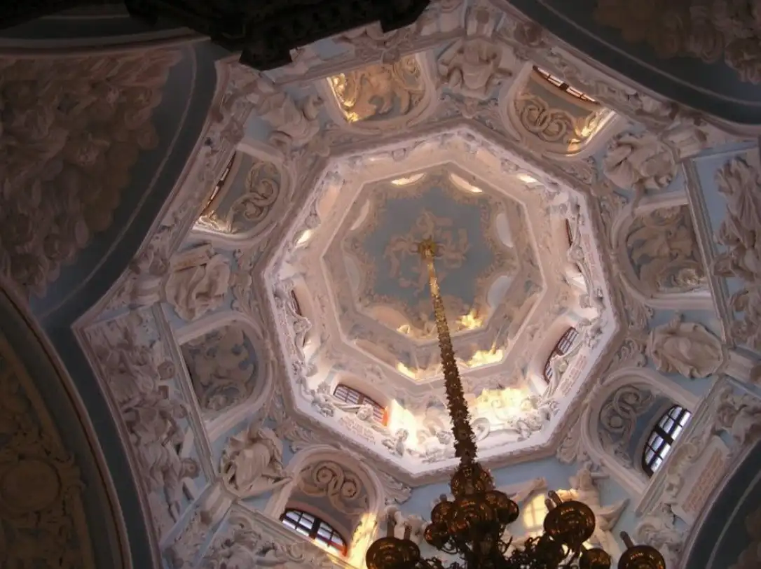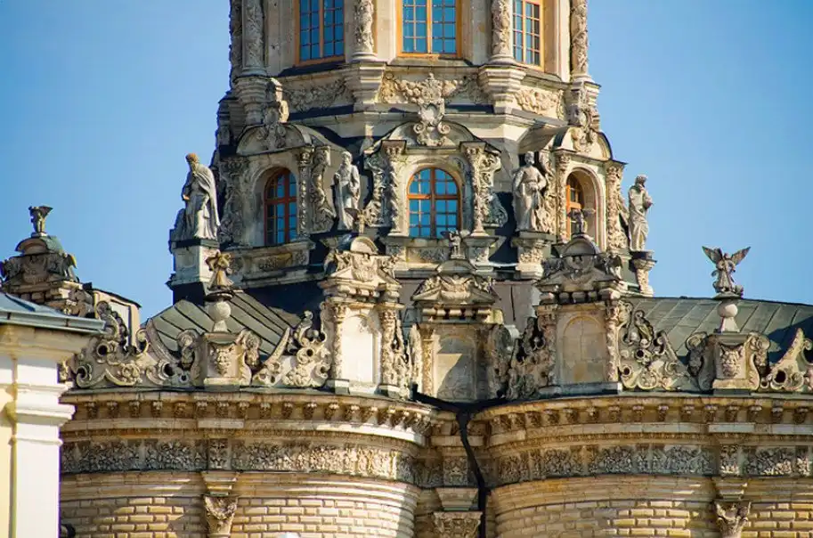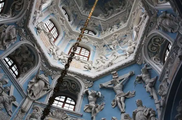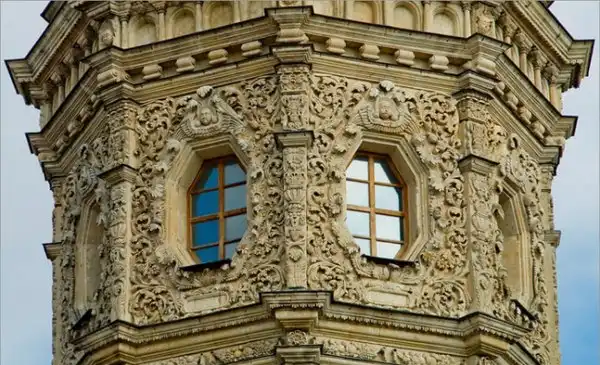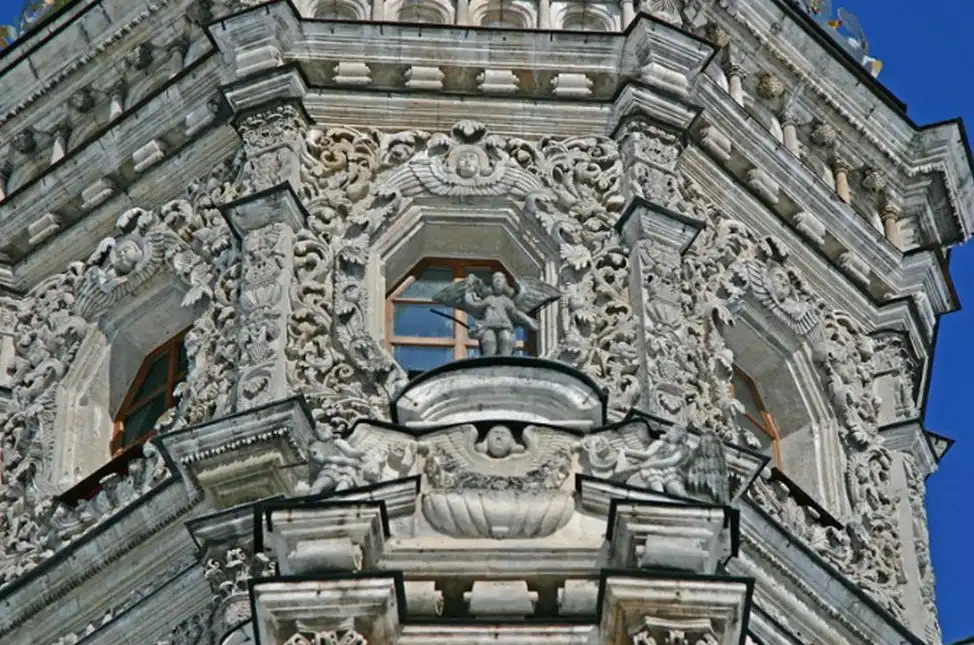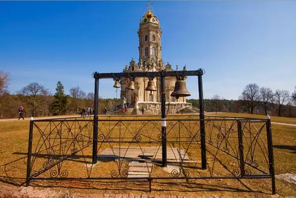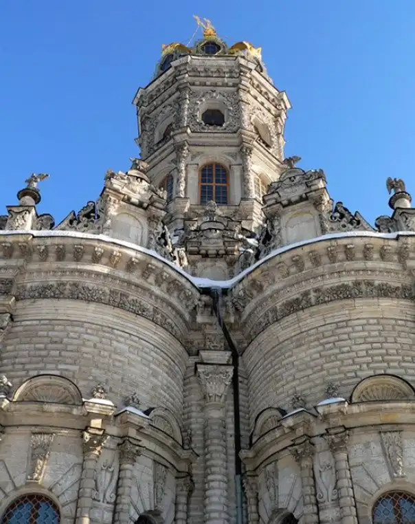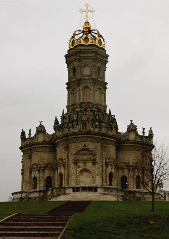 В 1697 г., когда церковь была готова, Патриарх Адриан разрешения освятить ее не дал, т. к. узрел в архитектуре храма подражание западным католическим образцам, несмотря на то, что во внешнем убранстве присутствовали элементы древнерусского зодчества. Место для церкви выбрано удивительно удачно - на холме, там, где Десна сливается с Пахрой. Церковь была поставлена на высокий фундамент и в плане представляла равноконечный крест. Церковь окружена открытой галереей, на которую ведут четыре лестницы, над ее центральной частью поднимается высокая башня, увенчанная куполом в виде позолоченной короны с ажурным крестом. Во внешнем убранстве и внутри храм изобиловал скульптурными изображениями и статуями, отражавшими влияние европейского барокко XVII в.