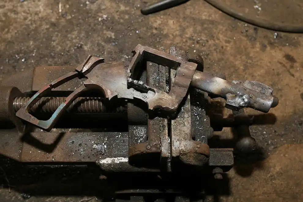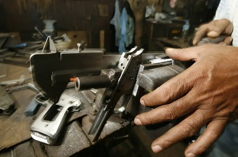 Хосе берет в руки пистолет, смотрит в прицел. Задумывается на мгновение, а затем вкладывает форму в тиски, которая на данный момент является не более чем подобием будущего пистолета, куском металла. Хосе Арнескару предстоит провести не один день за работой, прежде чем эта форма обретет свою огневую мощь. Этот мускулистый 33-ех летний рабочий прикладывает всю силу, работая над затвором. «Это самая сложная часть», говорит он запыхавшись. «Потребуется не меньше недели, чтобы закончить работу». Это важнейшая часть оружия, поэтому в работе Хосе будет использовать только напильник.