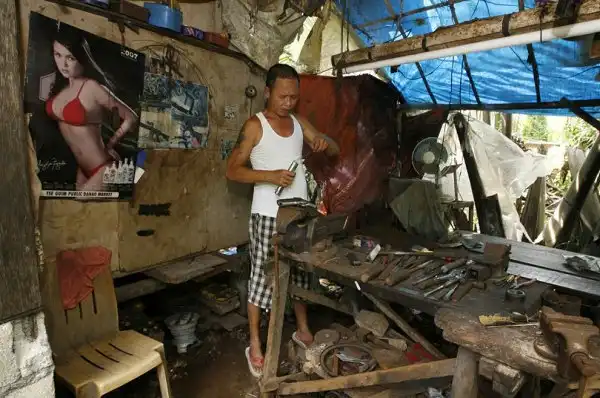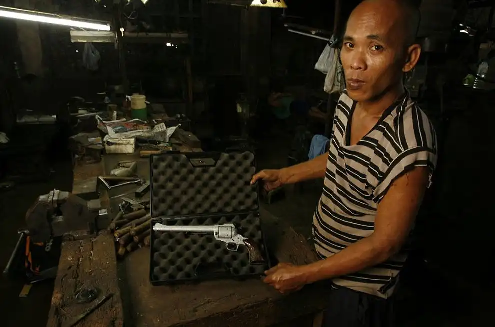 Самыми популярными на Филиппинах являются пистолеты-автоматы УЗИ и Ингрэм, даже, несмотря на то, что они запрещены. На фотографии изображен один из ведущих специалистов по производству такого оружия мистер Данте Рамонеда.