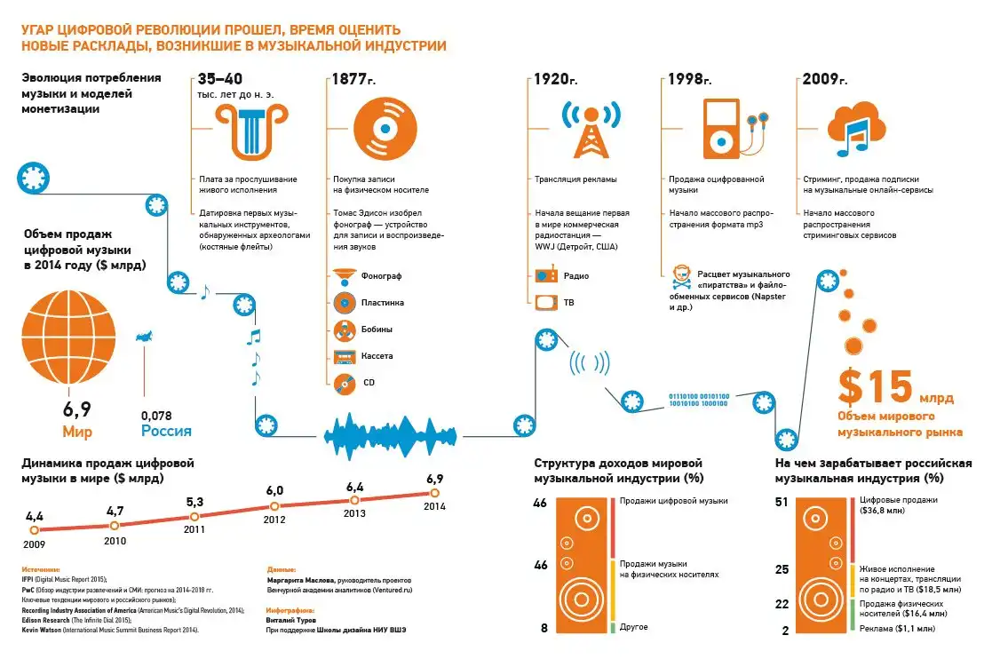 Цифровая революция в музыкальной индустрии прошла свой экватор: по данным Международной федерации производителей фонограмм (IFPI), в 2014 году цифровые продажи ($6,85 млрд) впервые превысили доходы от продажи музыки на физических носителях — дисках, кассетах, виниле ($6,82 млрд). За последние десять лет произошел не просто технологический переход с аналоговых носителей на цифровые. В музыкальной индустрии поменялось практически все: бизнес‑модели, принципы производства, продвижения и дистрибуции контента, способы монетизации таланта и взаимоотношения между правообладателем и потребителем. Сегодня индустрия зарабатывает деньги совсем по-другому.