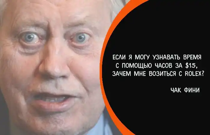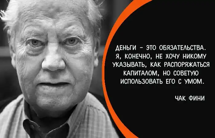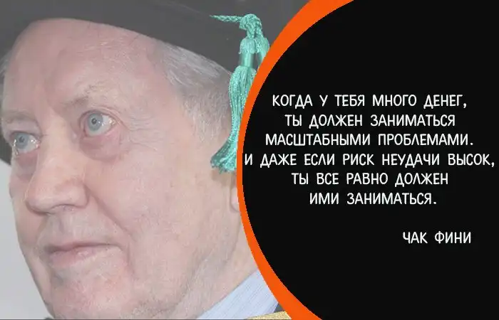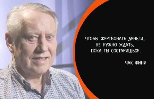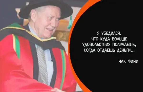 Он основатель Duty Free. Ему 82 года. Он заработал состояние в 7,5 миллиарда долларов. У него нет машины, он летает только эконом-классом и носит Casio на каучуковом ремешке. Его можно было бы назвать скупердяем, если бы не тот факт, что за 30 лет он потратил на благотворительность - образование, здравоохранение, науку, содержание домов престарелых по всему миру - более 6 миллиардов долларов, оставаясь при этом в тени. Билл Гейтс назвал Чака Фини идеальным образцом для подражания, отметив, что он является лучшим примером того, как следует творить добро при жизни.