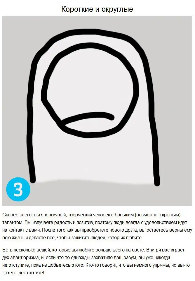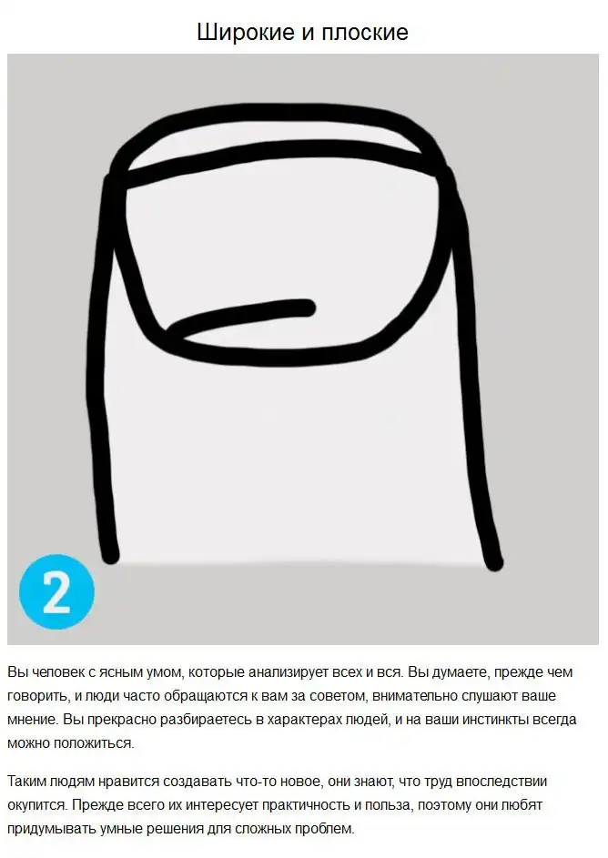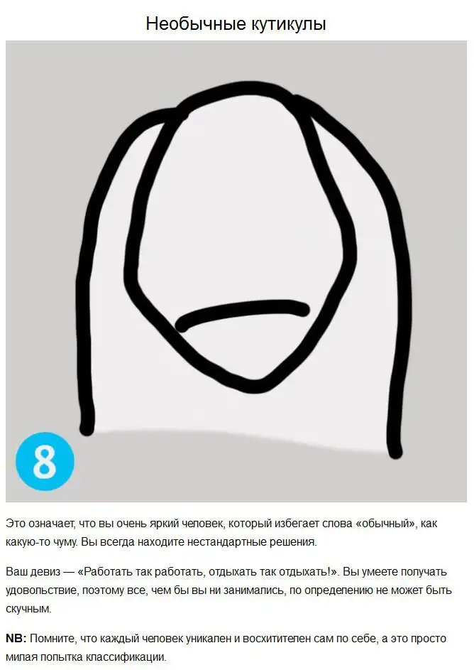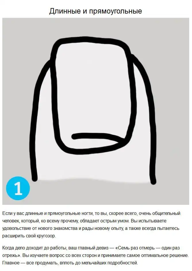 Оказывается, ногти на наших руках могут кое-что рассказать о характере человека. Взгляните на картинку и на свои ногти. Выбрав похожий вариант, прочитайте особенности своего характера.