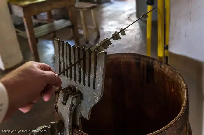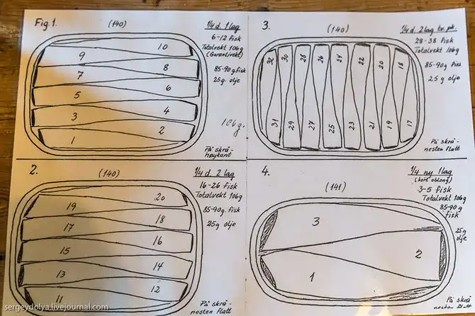 Через некоторое время придумали специальный аппарат, в который укладывали шпроты головой вниз и пронзали всех рыбок разом: