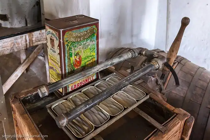 После укладки необходимо добавить масло. Этот процесс тоже со временем претерпел автоматизацию: сперва его наливали вручную в каждую банку, потому изобрели насос, разливающий нужное количество по 10 емкостям одновременно.