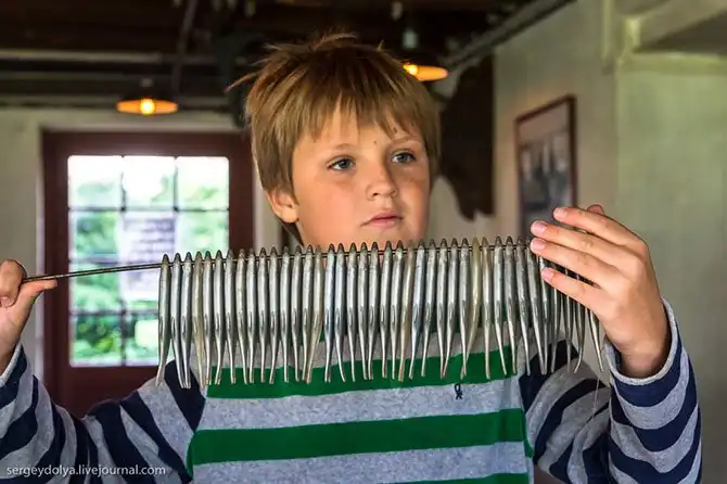 Затем её вручную насаживали на спицы для последующего копчения. За час рабочий мог нанизать таким образом до тысячи рыбешек: