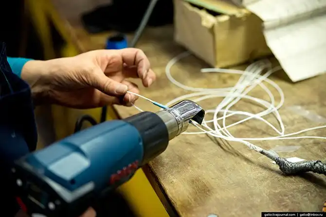 Выполнение операции по термоусаживанию защитной трубки провода авиационного жгута.