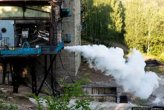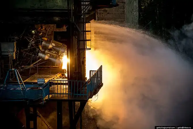 Наклонные огневые испытания серийного ракетного двигателя на испытательном комплексе ОАО «Кузнецов» в поселке Винтай.