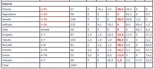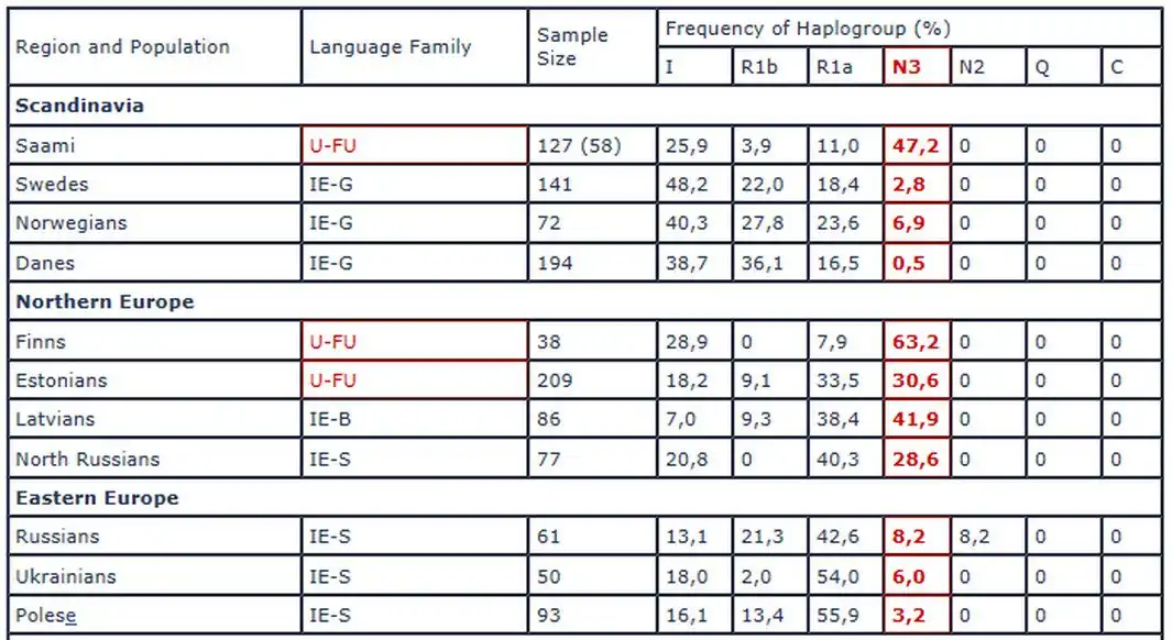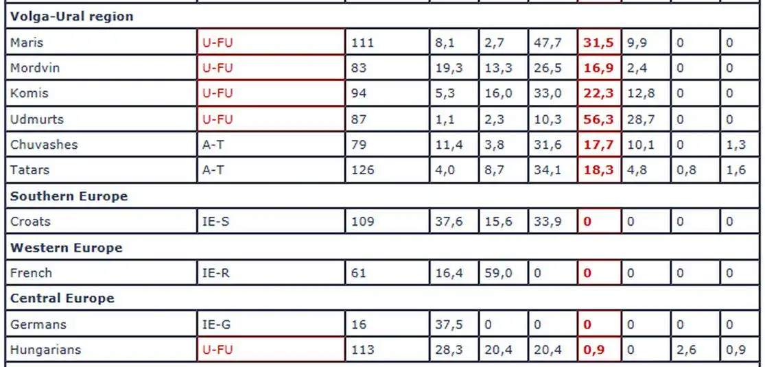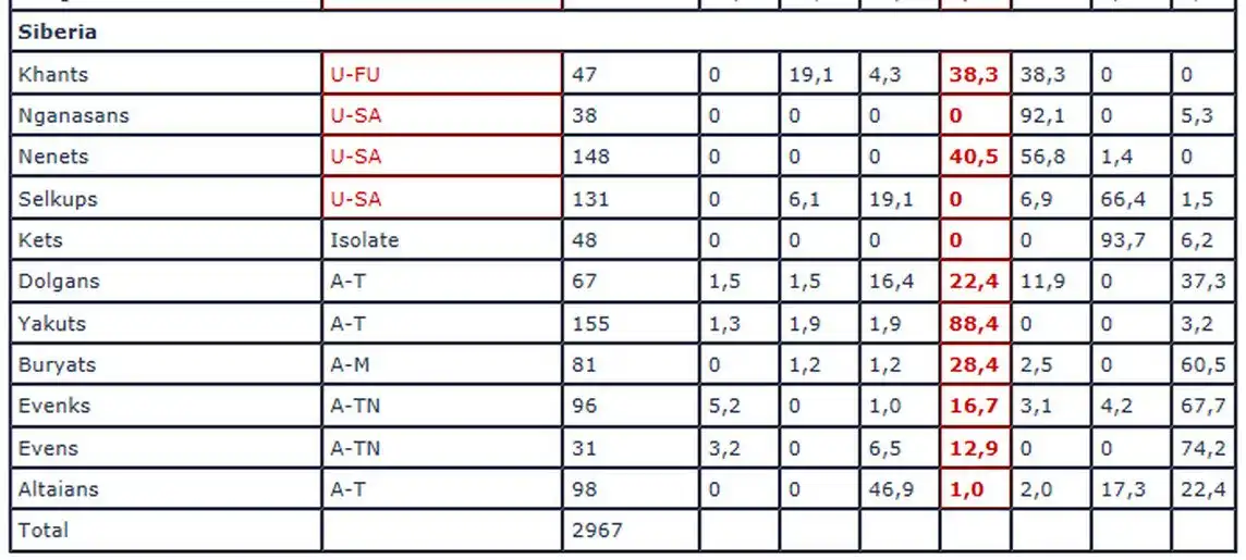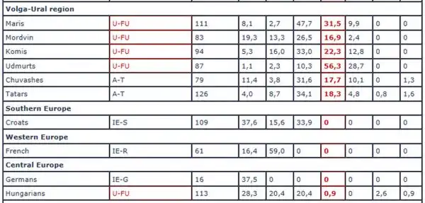 Ниже представлена таблица частоты ключевых гаплогрупп Y-хромосомы народов Евразии (Tambets, 2004)
