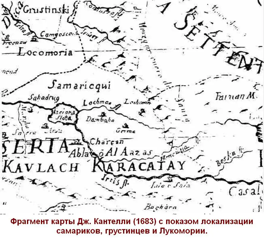 На карте 1683г Дж. Кантелли, южнее Лукомории (Lucomoria), сделана надпись Самарики (Samaricgui, или Samariegui). Кто или что такое самарики, выяснила недавно Томский доктор исторических наук, Галина Ивановна Пелих (1922 - 1999). Она опубликовала обстоятельную статью о первых русских поселенцах, которых звали самары и которые, по преданиям, пришли в Сибирь с реки Самара, впадающей слева в Днепр. Но так ли было это на самом деле? Галина Пелих стала заниматься этим вопросом и предположила, что уход самаров в смутные ХIII-ХIV века из-за Дона в Сибирь может быть был вызван тем, что там начались "страшенные войны". Наверное, поэтому прижилось в Сибири название этих людей как челдонов-чалдонов (человек с Дона). Но Дон на старорусском означает реку и где бы не протекали реки, они в обиходе назывались Дон (вода). Отсюда: до дна, днище, судно и т.д. Наряду с обобщённым названием, рекам давали имя.