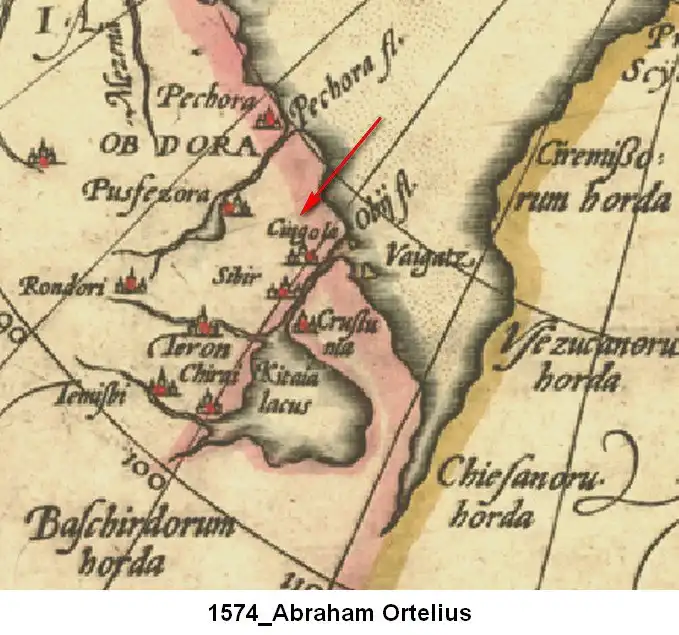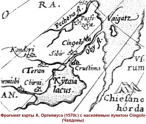 На карте нидерландского картографа Абрахама Ортелиуса, изданной за одиннадцать лет до похода Ермака, в Среднем Приобье было показано поселение Цинголо (чалдоны).