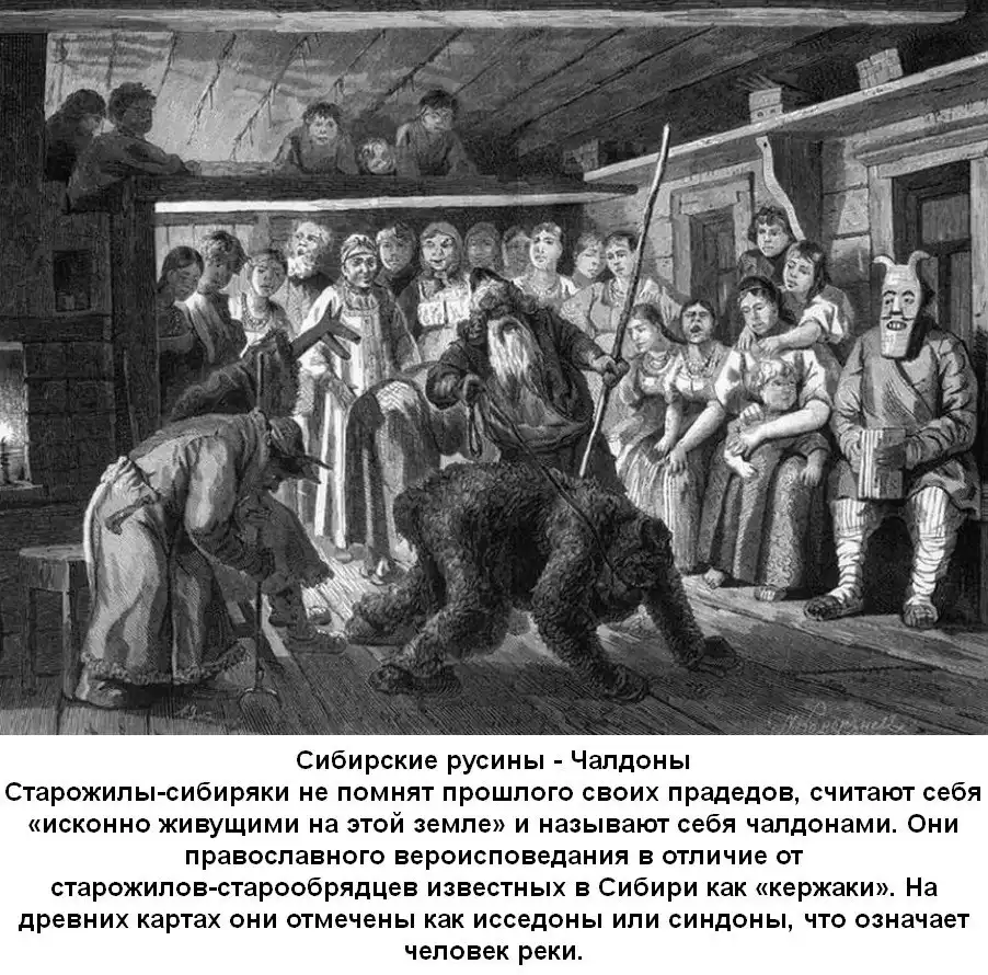 После Ермака русские переселенцы, встретив в Сибири своих единокровцев, называли их чалдонами и кержаками. Различались между собой так: кержаки - это староверы, сбежавшие в Сибирь от религиозных притеснений, чалдоны - это старожилы Сибири, проживающие здесь испокон веку, смешавшиеся с переселенцами с Дона, Днепра и Самары, которые так же вынуждены были покинуть свои родные места из-за религиозных войн, связанных с христианизацией Руси. Поэтому чалдонами в Сибири принято называть старожилов и потомков первых русских поселенцев, отличающих себя от сибирских казаков и коренных жителей.