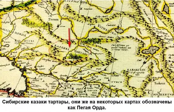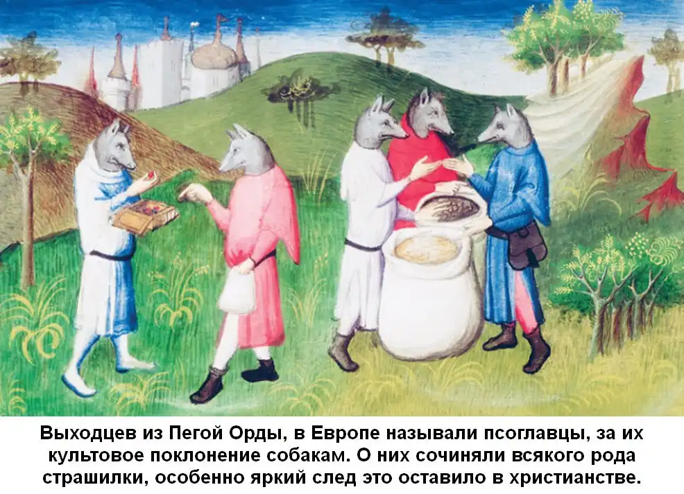 Пегая Орда в Сибири замалчивается или данные о ней искажаются, в свидетельствах о прошлом этой Орды, её многие воинские отряды несли службу в Руси-Орде. Эти некоторые племена фигурируют под названиями МАДЬЯРы, МАДЖАРы, МОГОЛы, МОНГОЛы, УГРы, БАШКИРы, ЯСы, ЯЗЫГи, ВЕНГРы, ХУНы, КУНы, ГУННы, ПЕЧЕНЕГи. Например, было среди них и такое воинское племя, у которого на знамени была изображена собака, для них это было культовое животное. От того в Европе их называли псоглавцы, от песьей головы. Последний раз так называли Чешских казаков "ходов", т.е. пеших воинов. Ходы-казаки жили вдоль границы Чехии и Баварии. Они сохраняли типичный казачий уклад жизни, по крайней мере, до середины семнадцатого века. В последний раз казаки-псоглавцы несли свою воинскую службу в 1620 году, когда Чехия утратила национальную независимость. Но не надо их путать с песьеголовыми - в средние века это были редкие дикие люди, предположительно неандертальцы.