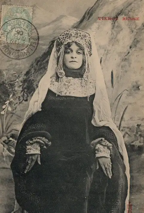 Что касается женщин, то они очень красивы, белы и полны, с темно-русыми волосами и, как все московиты, очень приветливы. Подобно своим мужьям, они носят платье до пят из сукна красного, фиолетового или голубого цветов, сшитое наподобие полукафтана, отороченное белым лисьим или собольим мехом, с длинными висячими рукавами, которые приколоты к платью. Других рукавов, куда бы они могли поместить свои руки, у них нет, так как рукава их рубашек необычайно длинны, и каждый имеет до 5 локтей длины; сшиты они из очень тонкого полотна и собраны на руках в складки. На голове носят род овального чепчика, а волосы заплетены в косы, украшенные лентами, которые спускаются позади плеч. Башмаки у них из русского сафьяна. Они носят также пояса из жемчуга средней величины. Спасибо Ламартиньеру за подробности, но и у Пушкина в русских сказках описывается то же самое.