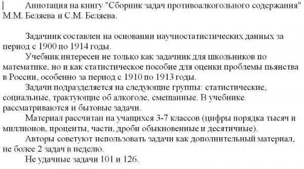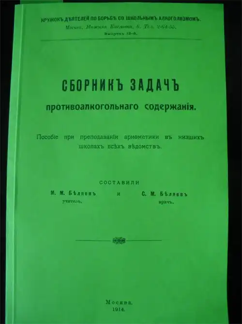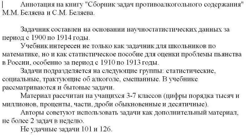 «Убедить во вреде алкоголизма безмерно легче того, кто знаком с влиянием алкоголя на преступность, вырождение и т.д., нежели воспитанного на пословицах: «пей, да дело разумей», «пьян, да умен – два угодья в нем» и тому подобных перлах народной мудрости», --- объясняет в предисловии концепцию задачника учитель М.М. Беляев
