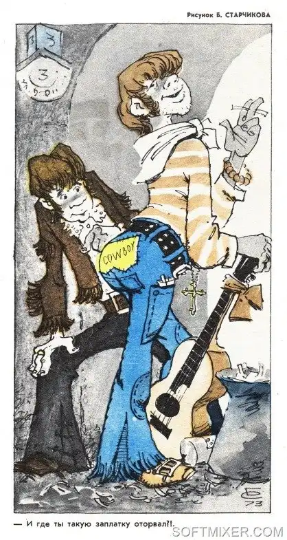 Нужно сказать, что сами джинсы, как вид удобных штанов, никогда не высмеивались в СССР. Наверное, потому что сами карикатуристы мечтали о них. Высмеивалась персонажи.