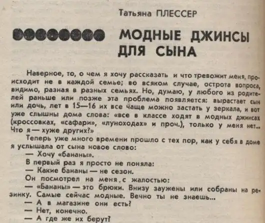Фрагмент типовой статьи о молодёжном вещизме. Газета 'Неделя'. 1984 г.