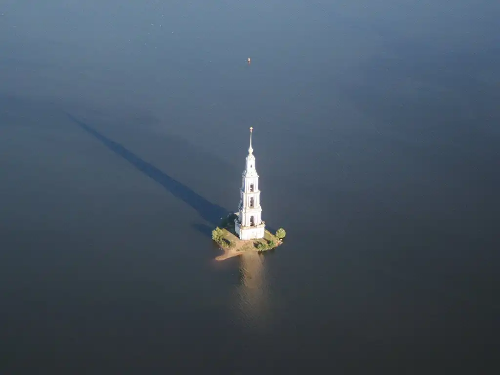 Колокольня в КалязинеНекогда это был высокий берег реки, на нем стояла обитель, перед ней была шумная рыночная площадь, а теперь посреди речной глади возвышается лишь колокольня, и только ветер иногда раскачивает старинные колокола.