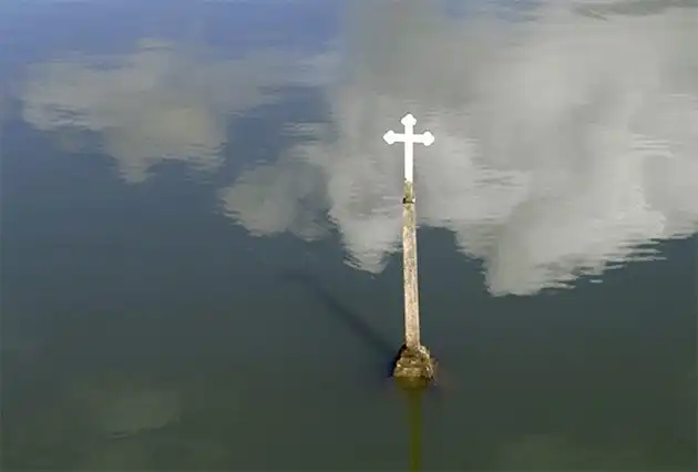 Церковь была полностью затоплена, но глобальные изменения климата последних лет привели к тому, что она регулярно стала появляться посреди озера