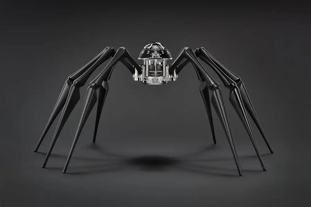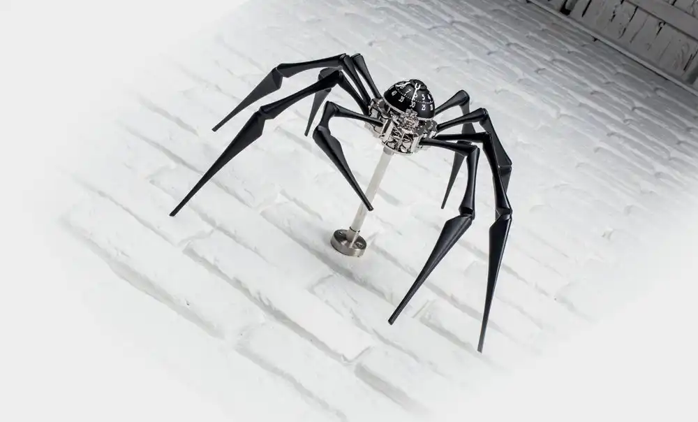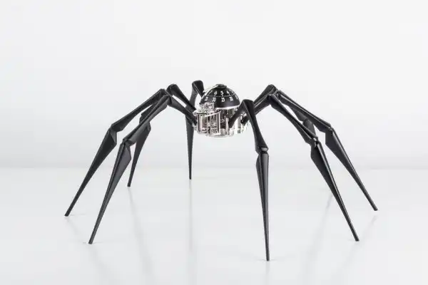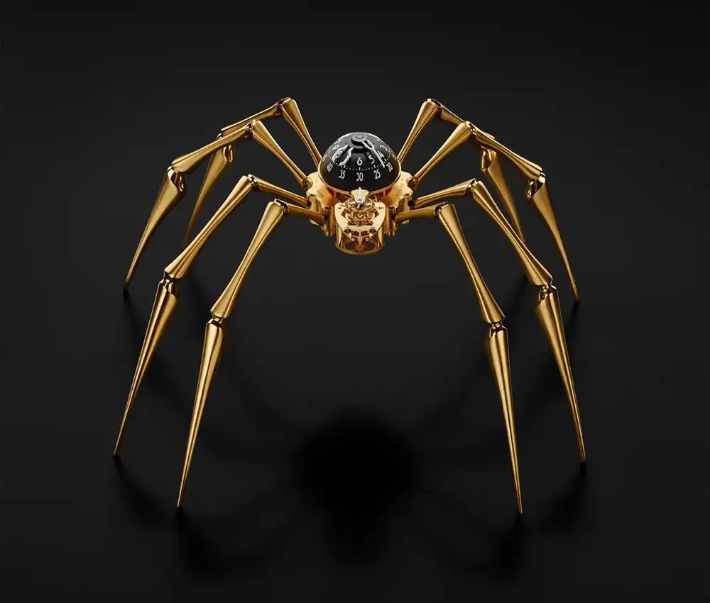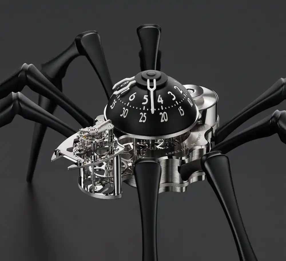 Они так и называются «Арахнофобия» (Arachnophobia) и выглядят, как жуткий массивный паук. Его тело черного цвета демонстрирует белые цифры, отображающие часы и минуты. Заводной механизм управляется при помощи нестандартно размещенного завода, под туловищем «паука». Одного завода хватает ровно на восемь суток времени. Паук может стоять на столе, а может и фиксироваться вертикально на стену. Часы выпускаются в черном варианте покрытия, либо с покрытием 18-каратным желтым золотом. Цена варьируется от $15700 до 17900 долларов США.