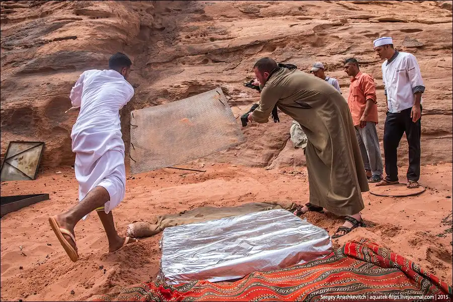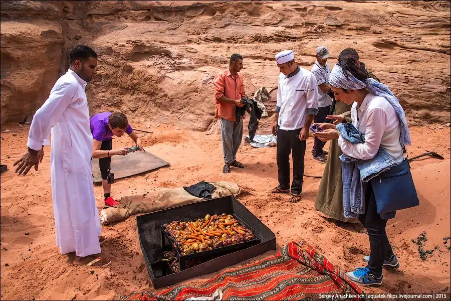 Выкапывать еду из песка мне еще не доводилось. Но, как говорится, все когда-то случается в первый раз. И прежде, чем взять в руки нож с вилкой, сначала придется поработать лопатой. В прямом смысле слова. - Давай, давай, скорее! Пора выкапывать нашу еду, - бедуин быстрым шагом засеменил к песчаному бугру, около которого уже суетились двое других обителей пустыни с лопатами. Они бодро раскапывали раскаленный на солнце песчаный холм, приближая момент истины....