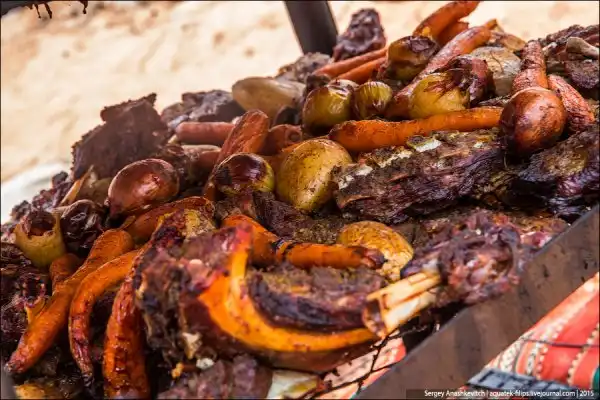 Самое главное сделать так, чтобы песок не проник в яму и не попал в пищу. Для этого используется несколько слоев закрытия ямы - фольга, металлический лист, ковры в несколько слоев. Когда блюдо достают из ямы, все эти слои разбирают друг за другом