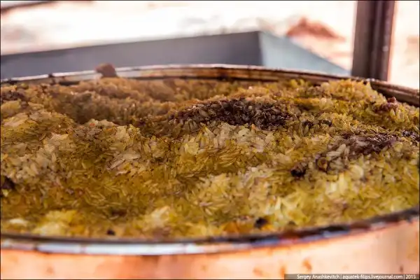 Зарб - три полноценных блюда одном. В нижнем уровне большой чан с пловом, в среднем - крупные куски баранины с овощами, в верхнем - запеченные овощи. Такое расположение не случайно. Находящиеся в самом верху, подальше от углей, овощи не горят в течение нескольких часов, пока зарб находится я раскаленной яме. Расположенное в среднем ярусе мясо в процессе тушения выделяет жир, который стекает в нижний ярус прямо в плов... Так сок от мяса не теряется зря, а рис приобретает необходимый аромат, вкус и жирность...