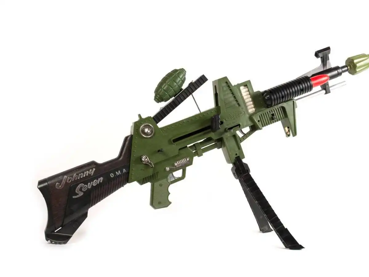 В 1964 автомат был самой продаваемой игрушкой для мальчиков. Johnny Seven One Man Army — игрушечный автомат, оснащенный “встроенным пистолетом, ракетницей и “бронебойными пулями”. Когда он использовался неугомонными мальчишками не по назначению, то был крайне опасен.