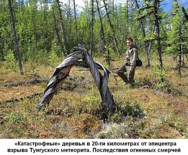 Миллионы деревьев на расстоянии до 45 км от места катастрофы были выворочены с корнем и брошены на землю, адский жар на несколько мгновений охватил землю, вспыхнули сухой мох и сушняк. Звуки взрыва были слышны на расстоянии до 1200 км от места взрыва, до 1000 км ощущалось сотрясение почвы, за 200-300 км выбиты стекла в окнах домов. Воздушная волна Тунгусского взрыва обежала земной шар и была зарегистрирована многими метеостанциями мира. Всему этому предшествовал полет крупного и необычно яркого болида, который наблюдали тысячи жителей Красноярского края на расстоянии до 400 км к востоку от места взрыва. В этот день ранним утром над территорией. Почти на тысячу километров вокруг слышались раскаты грома. Полет космического пришельца закончился грандиозным взрывом над безлюдной тайгой на высоте около 5 - 10 км с последующим сплошным повалом тайги в междуречье Кимчу и Хушмо - притоков реки Подкаменной Тунгуски, в 65 км от поселка Ванавара (Эвенкия). Живыми свидетелями космической катастрофы стали жители Ванавары и те немногие эвенки-кочевники, кто находился в тайге.