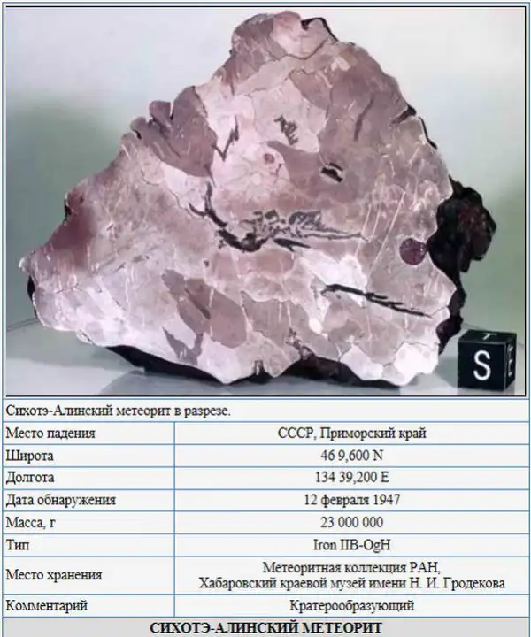 Когда этот массивный железный метеорит проревел с неба в феврале 1947 года, по словам очевидцев, он был ярче солнца. И когда взрыв разорвал его на части, его осколки осыпали землю на площади половины квадратных километров в горах Сихотэ-Алинь в Сибири.