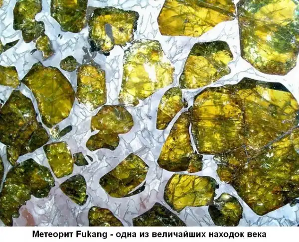 Возраст чудо-метеорита - 4,5 млрд лет, он ровесник нашей планеты. Найден Фукан был неподалеку от города Fukang (северо-запад Китая), в честь которого и был назван. Метеорит изумительной красоты состоит на 50% из железно-никелевой основы и на 50% из оливина, который иногда называют космическим драгоценным камнем. Оливин (его второе название хризолит) встречается и на земле, однако таких больших кристаллов в природе не встретишь.