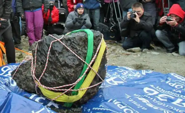 Всего космическая глыба весила более тысячи килограмм, но ненасытные туристы тут же захотели "отломить" кусочек, так что вес космического "подарка" стал неуклонно таять. Было принято решение разделить метеорит на сотни небольших частей, которые были выставлены на аукционах во всем мире.