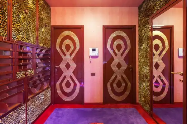 Шик и гламур сочится со стен этой небольшой, всего 200 кв метров, квартиры. Единственная деталь интерьера, которой не коснулась рука дизайнера – домофон. Белый жалкий домофон висит на обитой крокодиловой кожей стене прихожей. Он словно голый, хочется срочно прилепить на него пару кристаллов Сваровски.