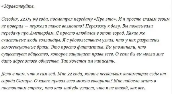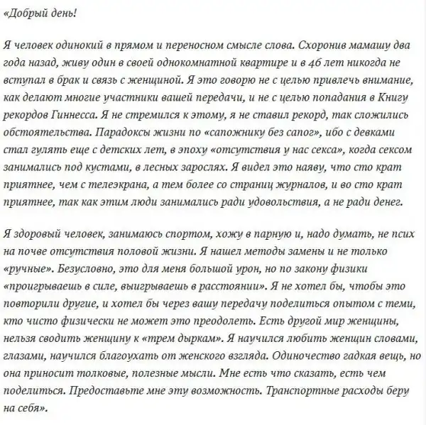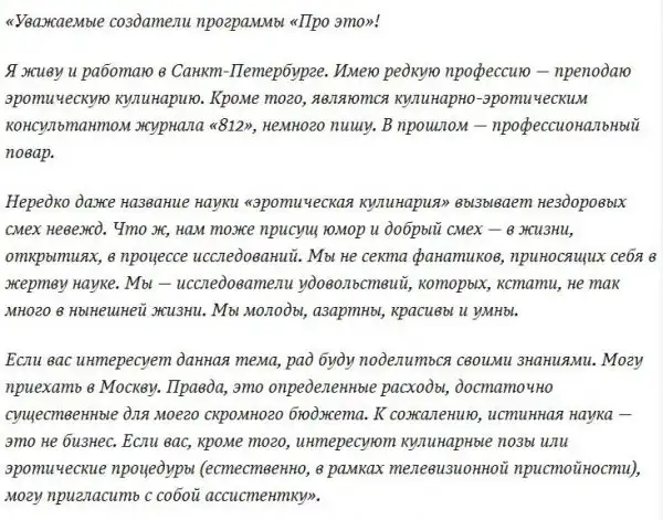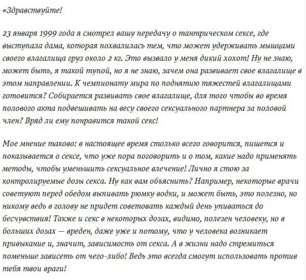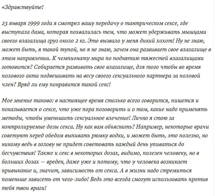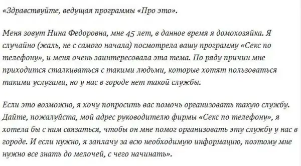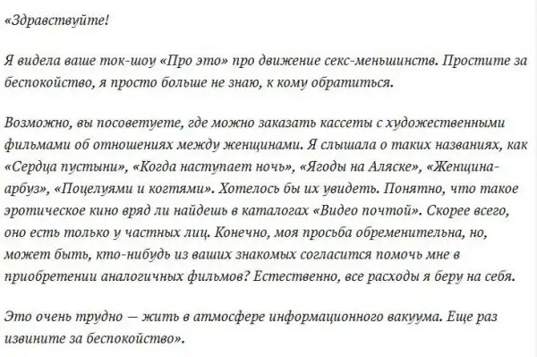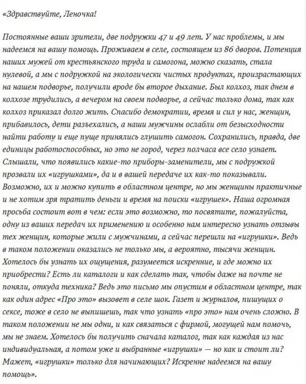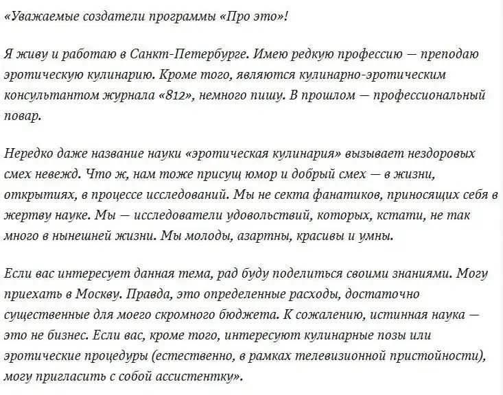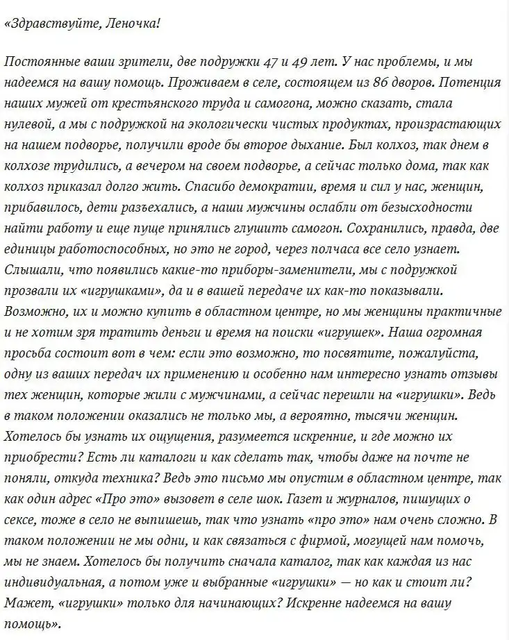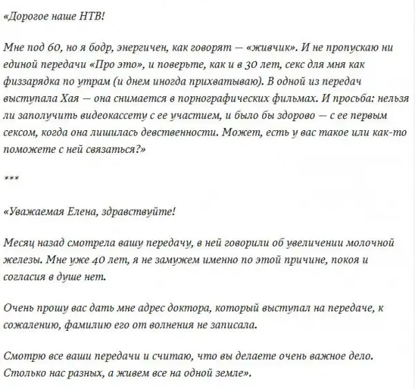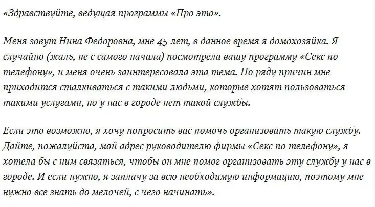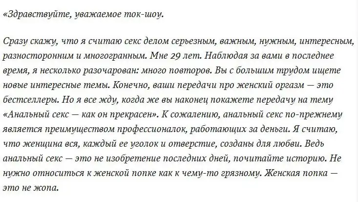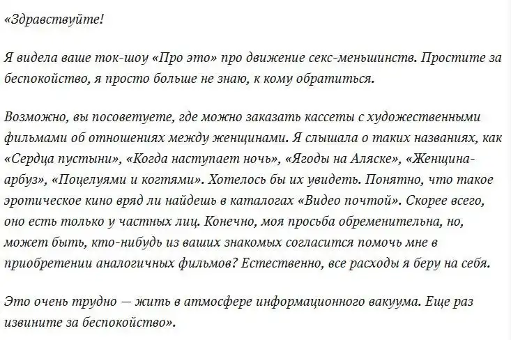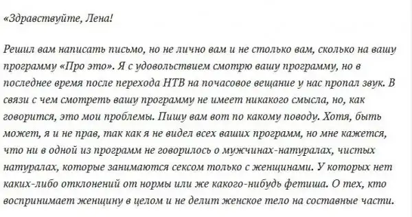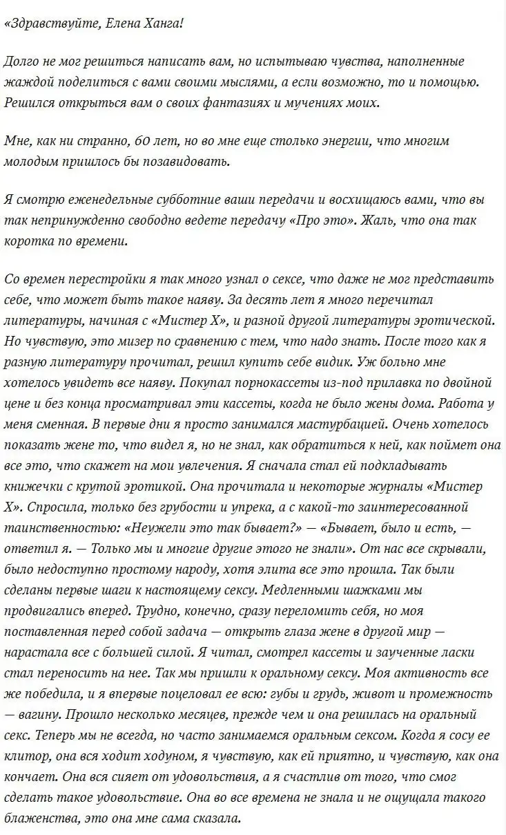 В период с 1997 по 2000-й год зрители канала НТВ смотрели революционное ток-шоу «Про это», ведущим которого была Елена Ханга. В эфире обсуждались вопросы личной свободы и секса. Совсем недавно раскрепостившиеся люди стали выставлять на всеобщее обсуждение свои проблемы в сексе и писать об этом письма в студию. Некоторые из этих писем ждут вас далее.